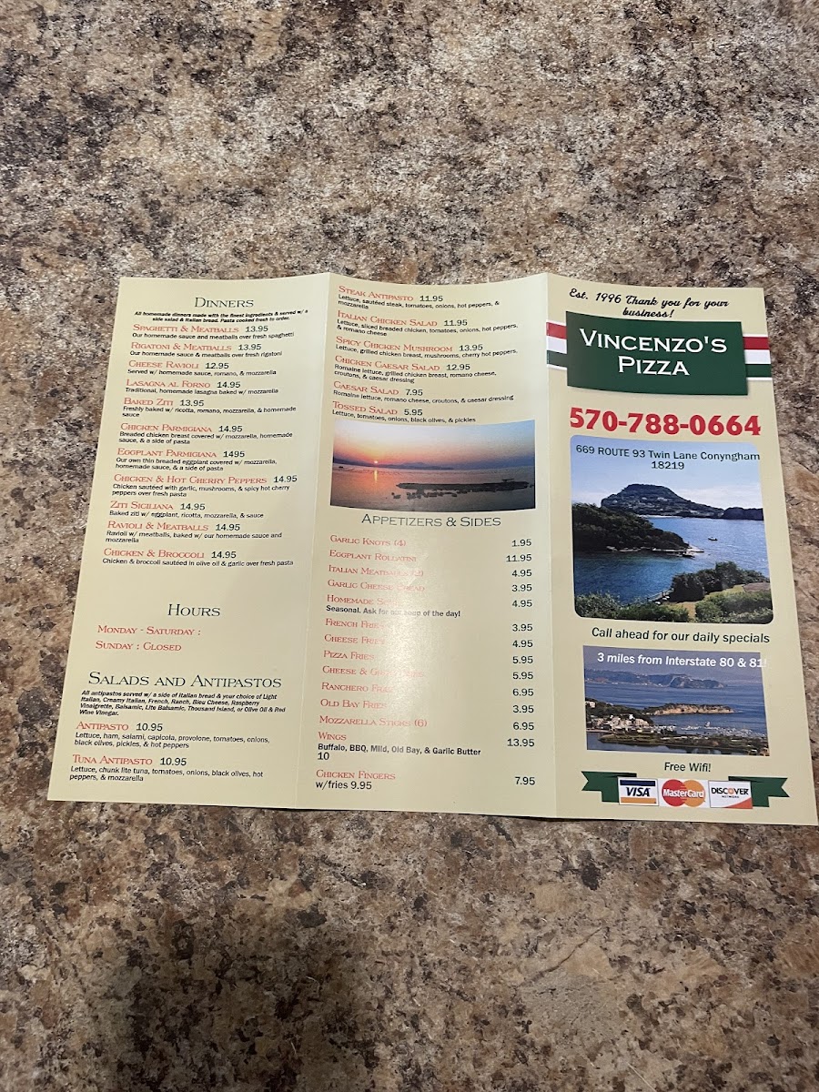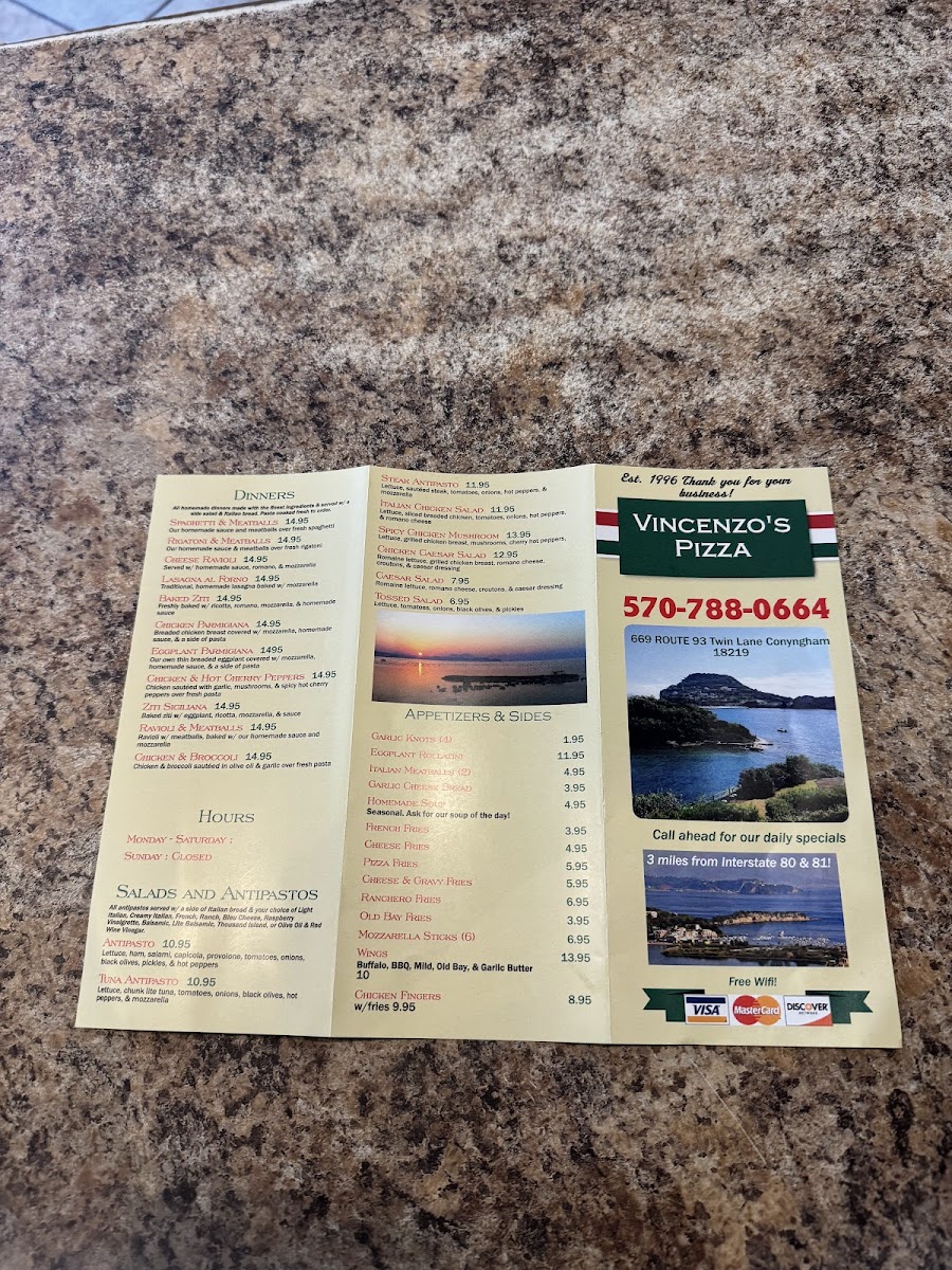 Welcome to Vincenzo’s Pizza, an authentic slice of New York style pizza nestled in Conyngham, PA. Known for its meticulous preparation and vibrant flavors, Vincenzo's is a culinary haven for pizza lovers. Each dish reflects the owner's dedication, making it a favorite for locals and transplants alike.